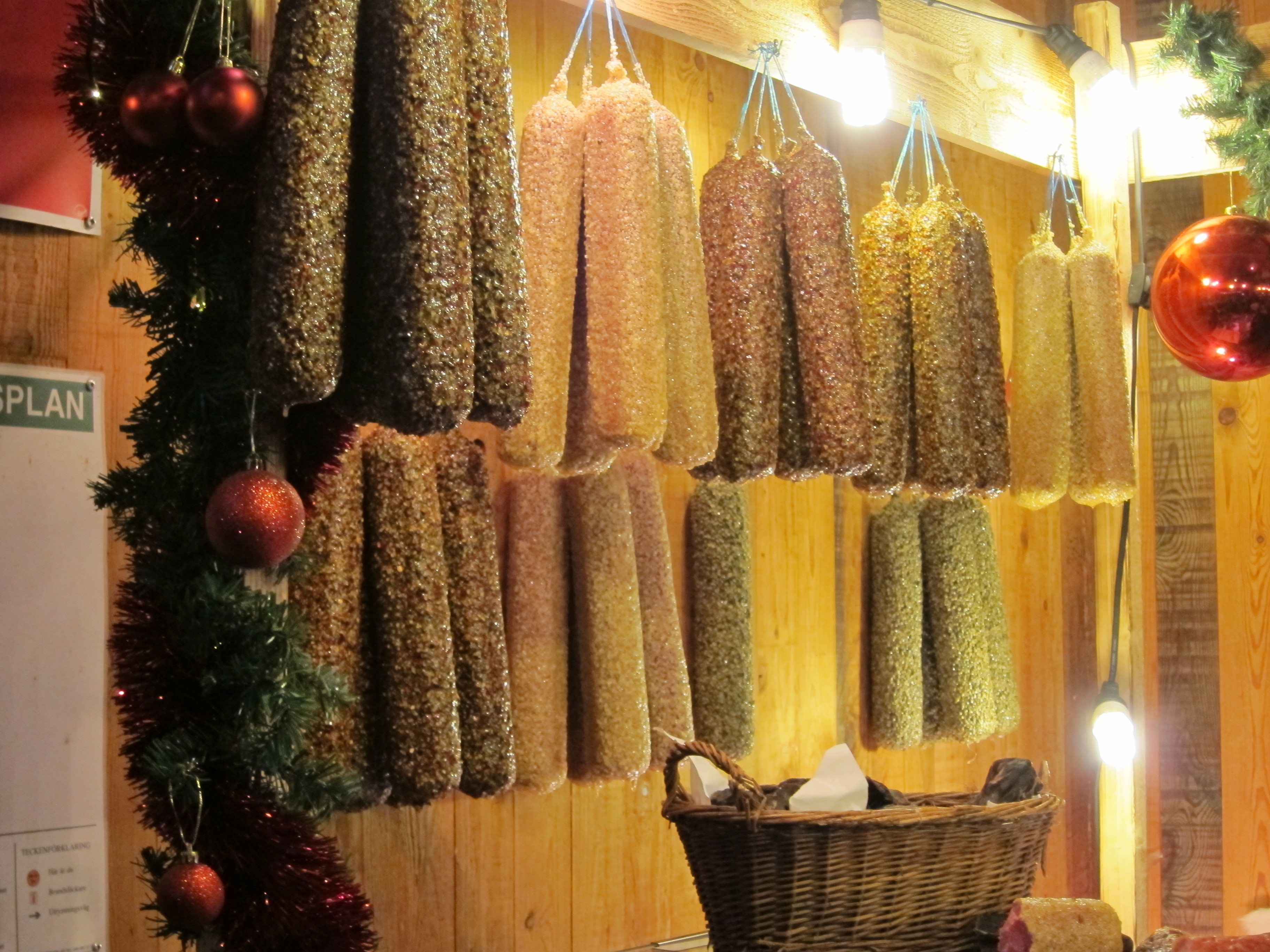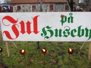 All of this I would like to share with you; but I can’t.  You see, I went to the largest Christmas Fair in all of Scandinavia with a thee-year old child named K.  And while I love K with all my heart, he is not the child you want with you to enjoy a cold, crowded, and bathroom-scarce festival.  K doesn’t like crowds.  K also doesn’t like walking.  So, here we are a happy family of four walking into the largest Christmas Fair in all of Scandinavia (have I mentioned that before?) with my lovely wife pushing K in his stroller, which he outgrew at least 8 months ago but refuses to go out without, M strapped to my back.  The manor at Husby has been perfectly preserved and those walking paths were not intended for such large numbers of people, or strollers.  Entering onto the property, we crossed a small bridge with a creek rushing beneath and on the right was an old mill house, with a still operational water wheel, which now housed vendors of coffee, tea, cheese, crackers, bread, cookies, and glogg.  We left the stroller outside and got K inside, but the press of the people was too much.  With M on my back, I could barely move and ended up knocking, a bit too roughly, into some of the holiday shoppers.  After finally emerging, without being able to sample nearly as many of the goods as desired, we made our way further onto the property and found Santa Claus, situated strategically next to a glogg stand.  (And the spiced apple and raspberry wine was delicious, unfortunately it was the only sample I was able to taste on this visit.)  Following our photos with Santa we made it to the next converted barn.  Inside were artisans selling hand-blown glass, handcrafted Nordic Santas and gnomes, as well as a variety of jewelry.  This is where K had too much and enough was enough.  Like a good three-year old boy, he wanted to touch everything and play with them, but a hand blown glass Christmas tree was not exactly a toy we want him to play with; so after continually telling him not to touch, he breaks down and throws a mini tantrum.  We acknowledge his feelings and decide that it is probably not a good idea to bring K into these dark, crowded, and over-stimulating venues.