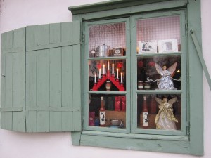 Window of a shop decorated in typical Swedish holiday style.