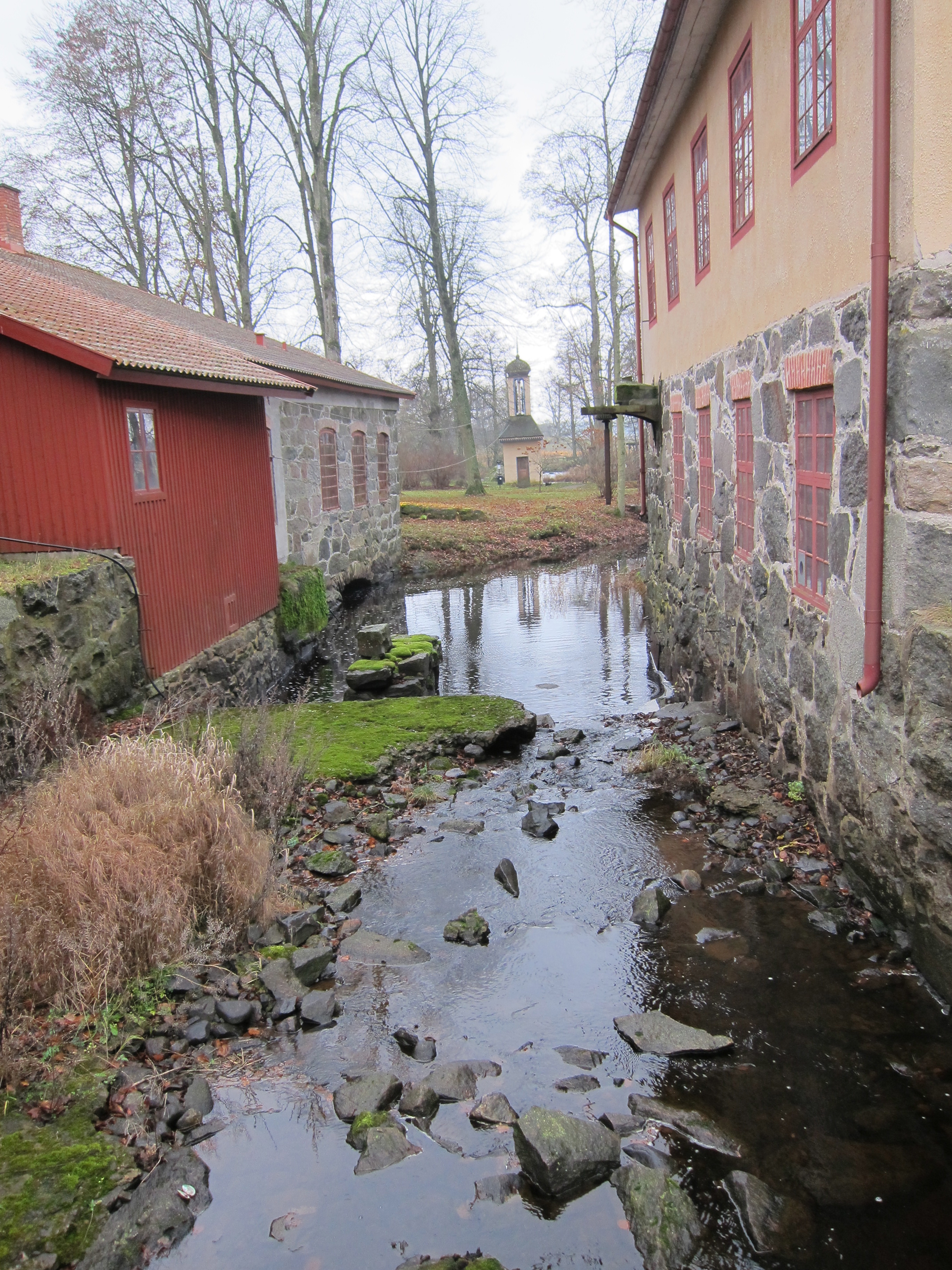 Creek between two historic buildings.