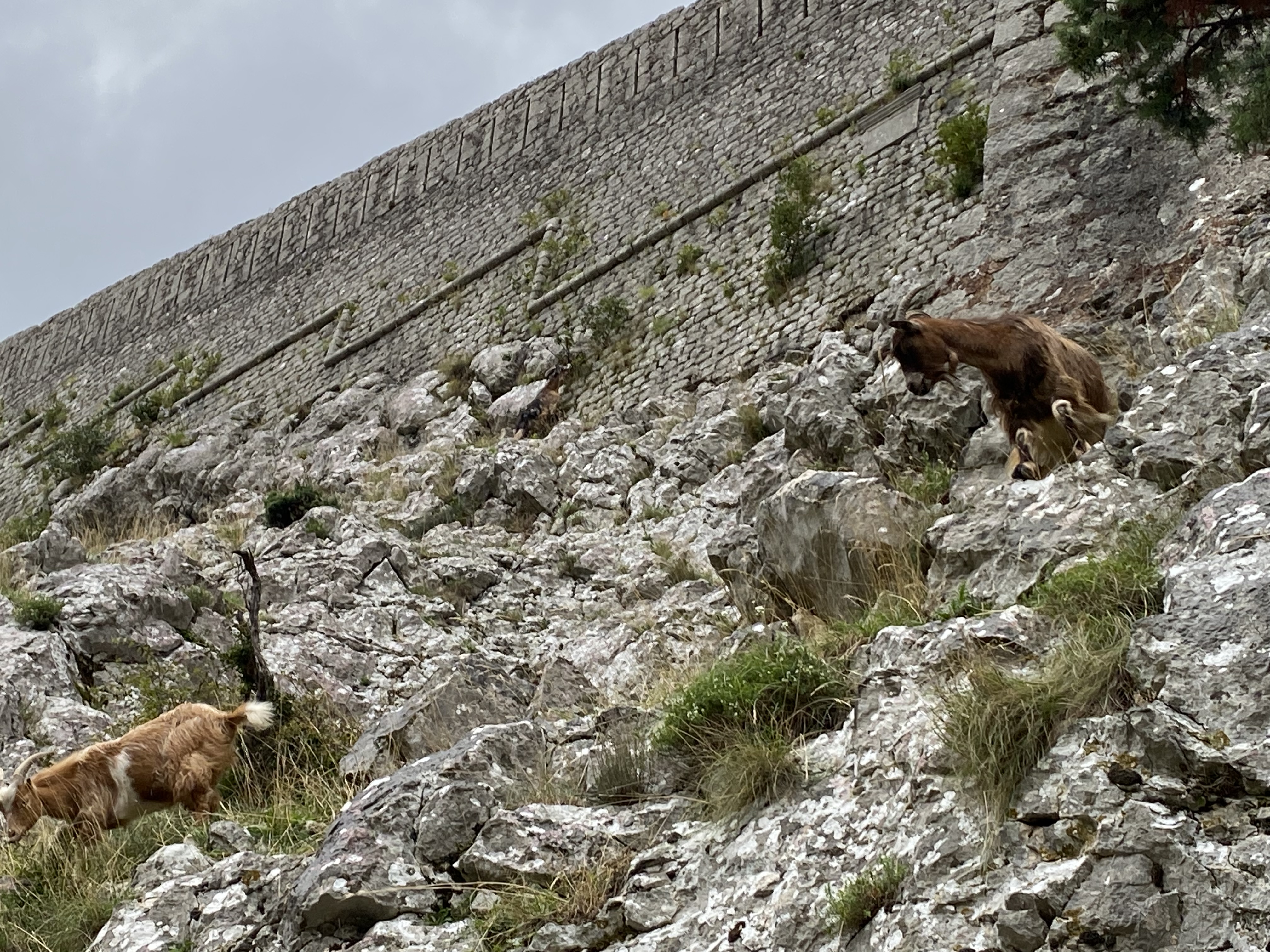 1. Goats of Kotor Fortress – The Fortress of Kotor sits high above the Old Town and the bay below; and while most will be swept away with the panoramic views, the medieval ruins, and the moody mystery of the swirling rain clouds, Momma S found complete delight with the ringing of bells from a herd of goats that had climbed the mountain and were foraging for plants and grasses behind the ruins. With Brother M, she found a cut through the wall, and a ladder fixed to the old fortress, where she climbed down to get a better look at the goats who would graze by the side of the great fortress of yore.